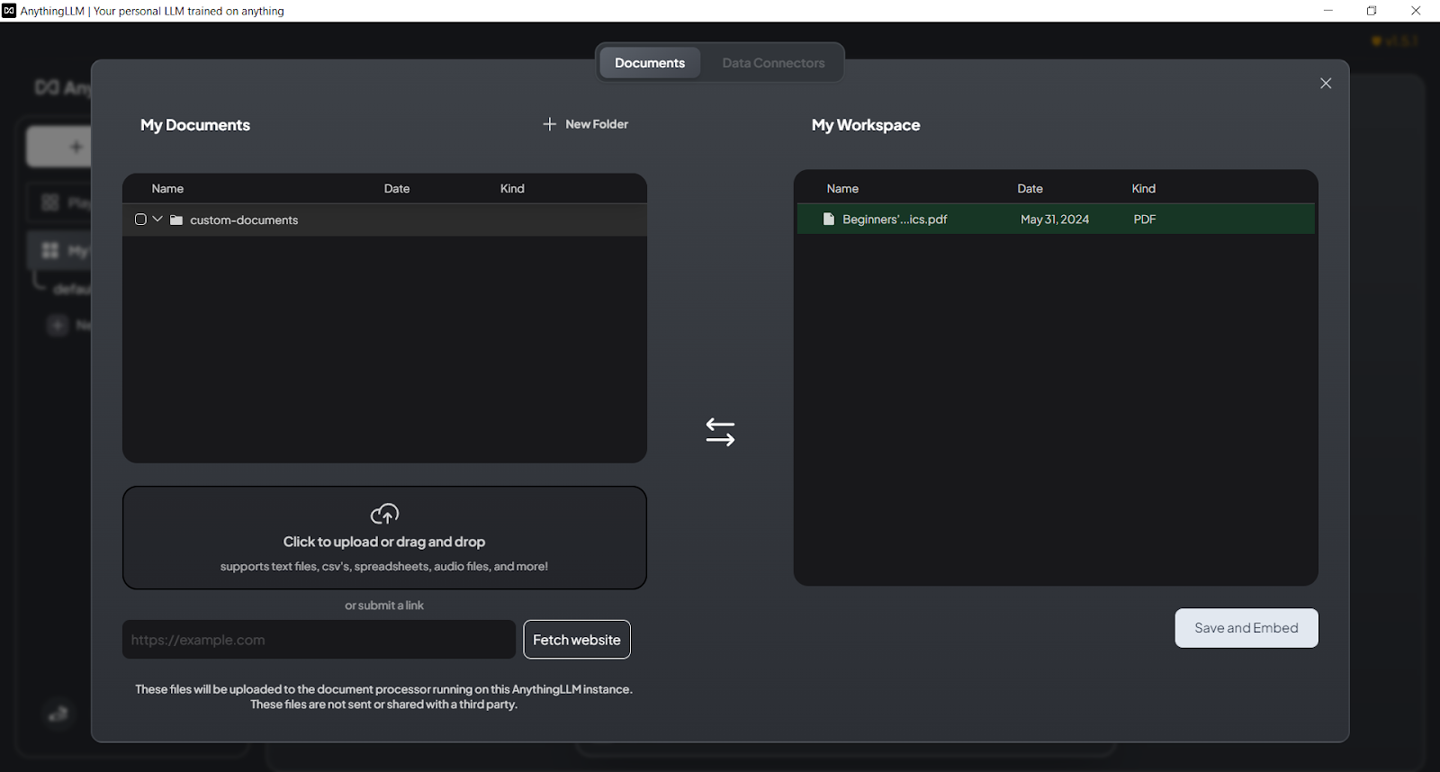 6. Wait for the documents to be processed and indexed by AnythingLLM, then click on “Save and Embed.”