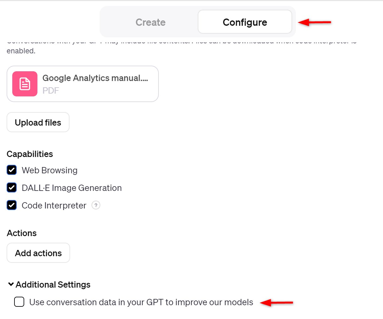 If you want users’ conversations with the chatbot to remain private and not be part of OpenAI’s training dataset, you should choose to build an Assistant over a Custom GPT. Although Custom GPTs offer the possibility of excluding user threads from training purposes, this option is only available if you have uploaded a knowledge file to the GPT. This setting can be found at the bottom of the GPT’s configuration page as shown in the image below. If, however, the GPT relies only on instructions and not on any knowledge file, this option is not available.