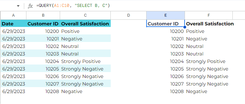 Imagine you have a dataset with customer data, and you want to filter the rows based on a specific condition, such as displaying only customers with ‘neutral’ satisfaction. You can use the QUERY function with a WHERE clause: