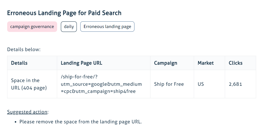 Let’s explore a scenario where a company embarks on a highly targeted marketing campaign, driving a steady stream of traffic to a carefully crafted landing page with the goal of converting visitors into valuable customers. However, despite meticulous planning and compelling messaging, the anticipated conversion rates fall disappointingly short. Recognizing the missed opportunity, the company turns to Baresquare Campaign Diagnostics to unearth the root cause. A ticket has been raised for an Erroneous Landing Page for this campaign, specifically a space in the URL, leading to an unfavorable user experience. They promptly fix the issue, ensuring users are led to the correct page and ultimately avoiding any wastage of budget.