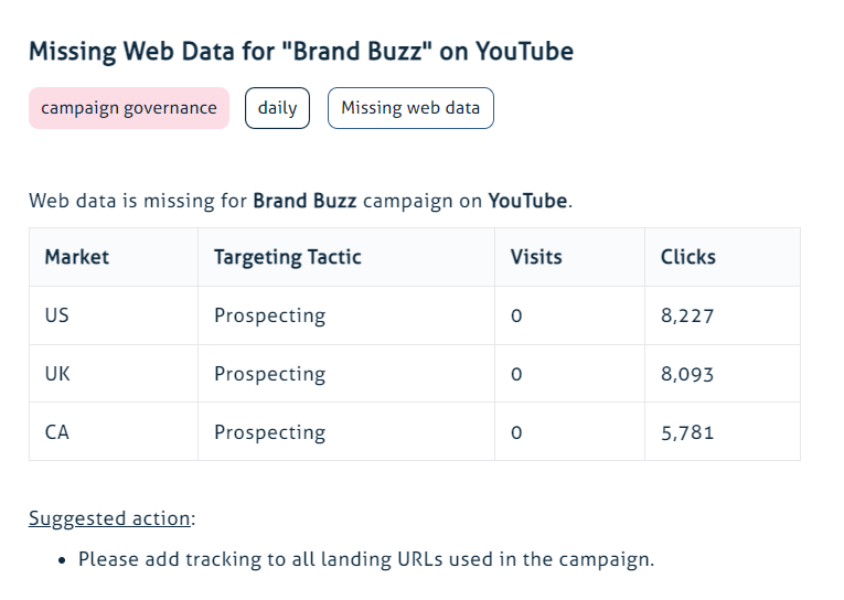 With data accuracy at its core, confidently allocate resources, refine strategies, and maximize your campaign impact. Unleash your true potential by identifying and resolving tracking gaps, landing page issues, incorrect naming, and underperformance. Proactively address challenges, pivot strategies, and elevate your marketing game.