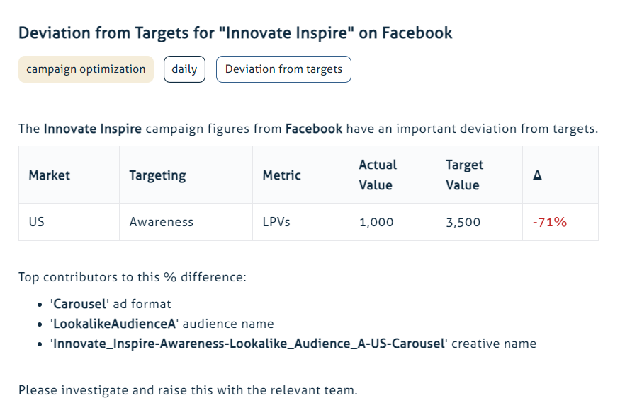 Campaign performance analysis can be a time-consuming endeavor, especially when dealing with large datasets. That's where automated insights come into play. With the help of advanced analytics tools and machine learning algorithms, marketers can leverage automation to rapidly analyze campaign data, detect patterns, and generate actionable insights. Having these insights automatically delivered every Monday, the analytics team gains the freedom to streamline their decision-making processes, identify trends, optimize campaigns in real time, and stay one step ahead of the competition.Embrace the efficiency of automated insights and unlock the true potential of your marketing strategies.