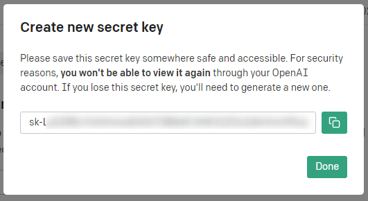 Click on “Create new secret key” and add a name. Copy the API key and keep it in a safe place.