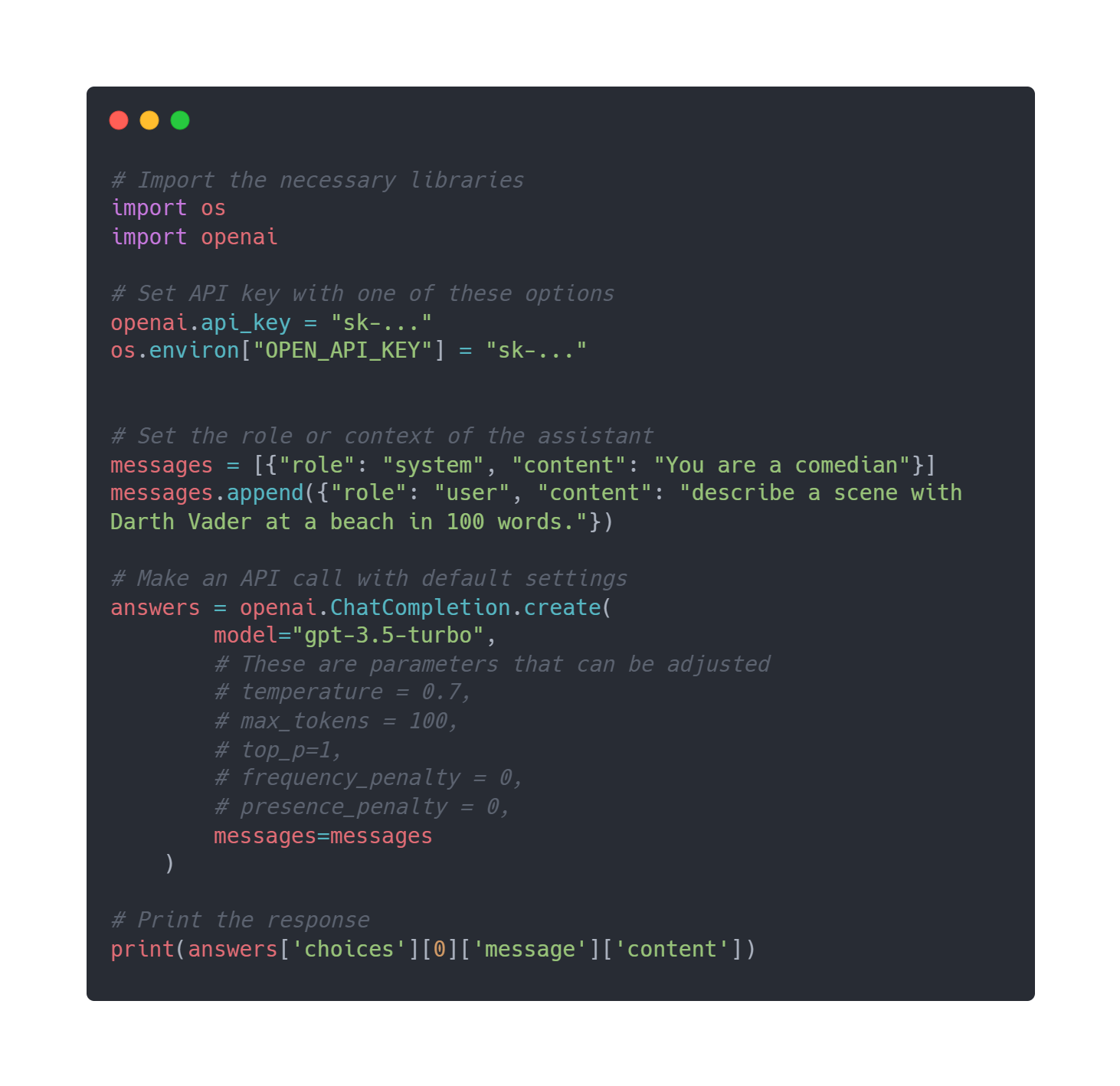 This is what the Python code for an OpenAI API call to the gpt-3.5-turbo (ChatGPT) model looks like: