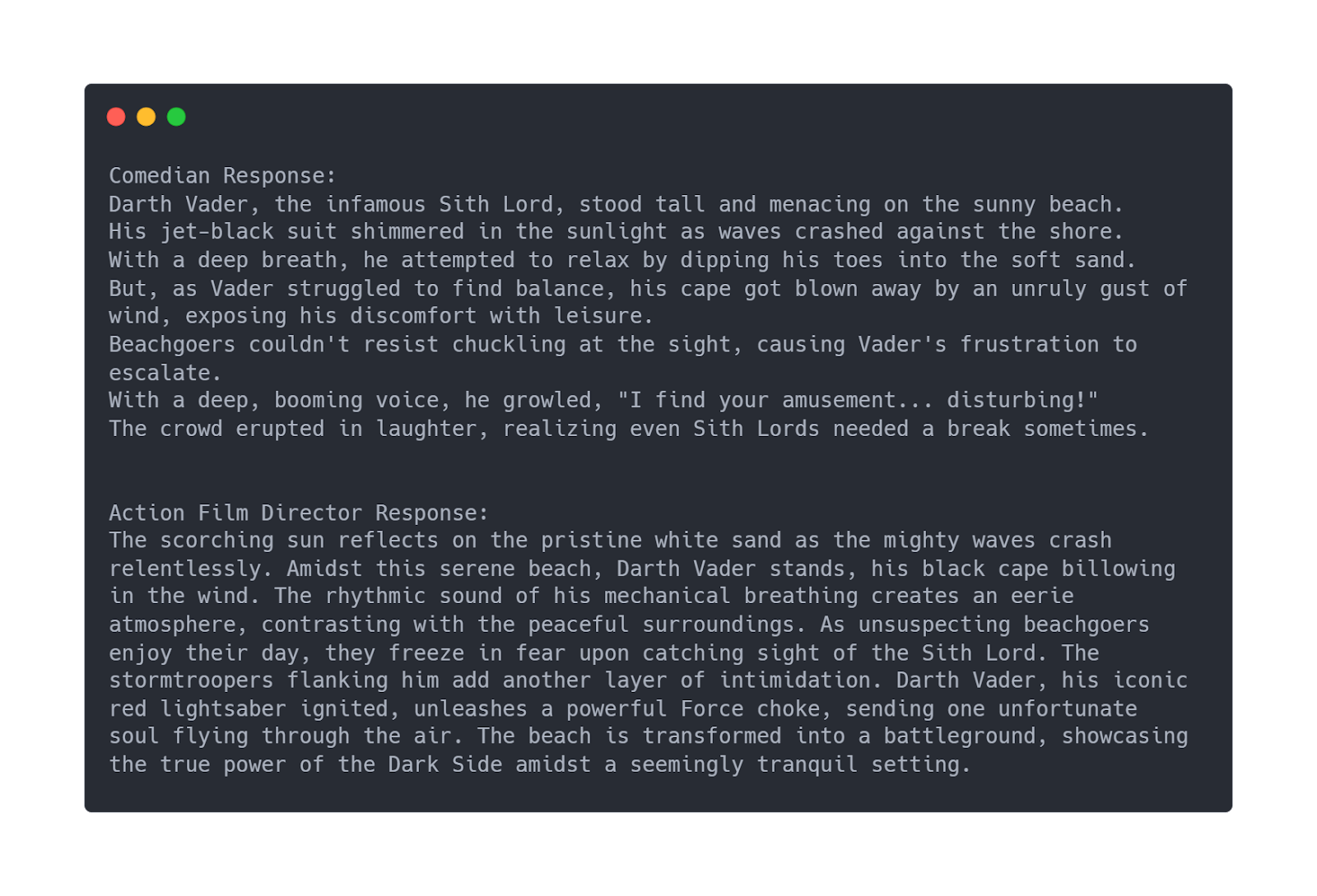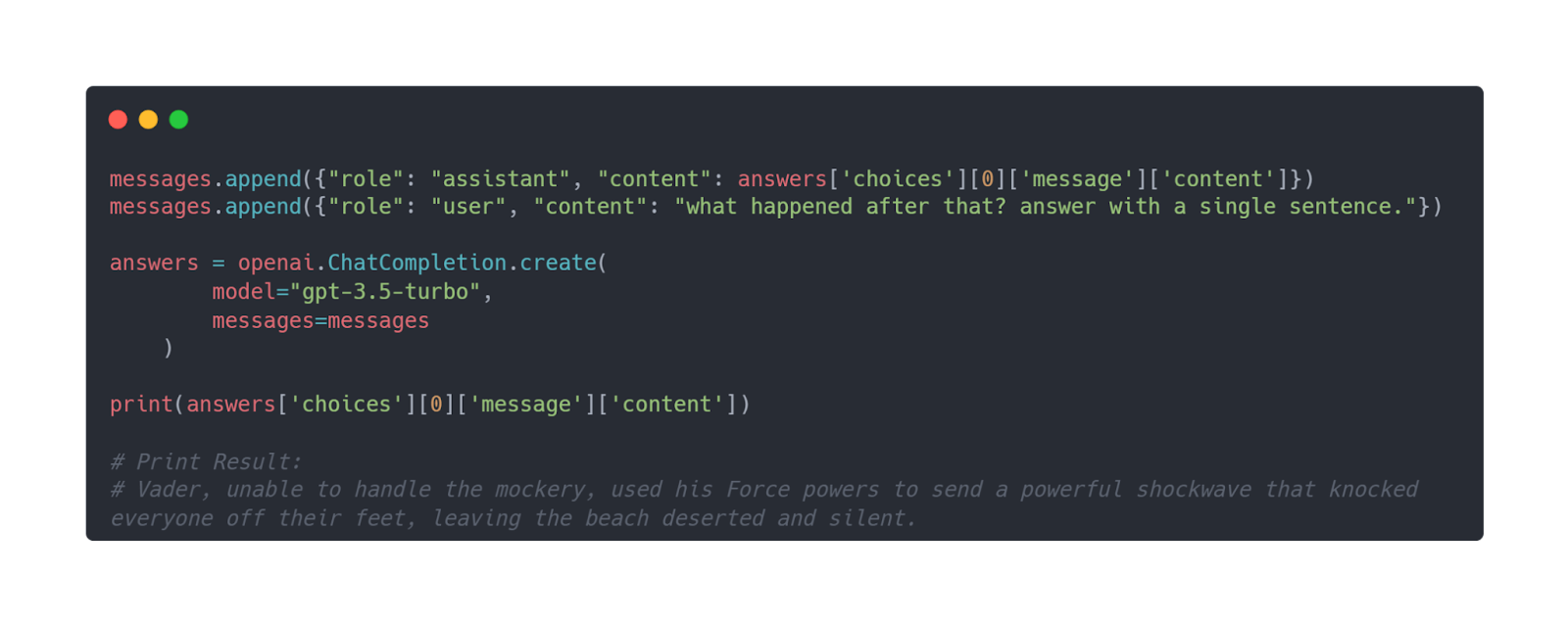 The answers of the chatbot can be appended to the “messages” list and can be used to send follow-up input or questions to keep the conversation going. An example can be seen below: