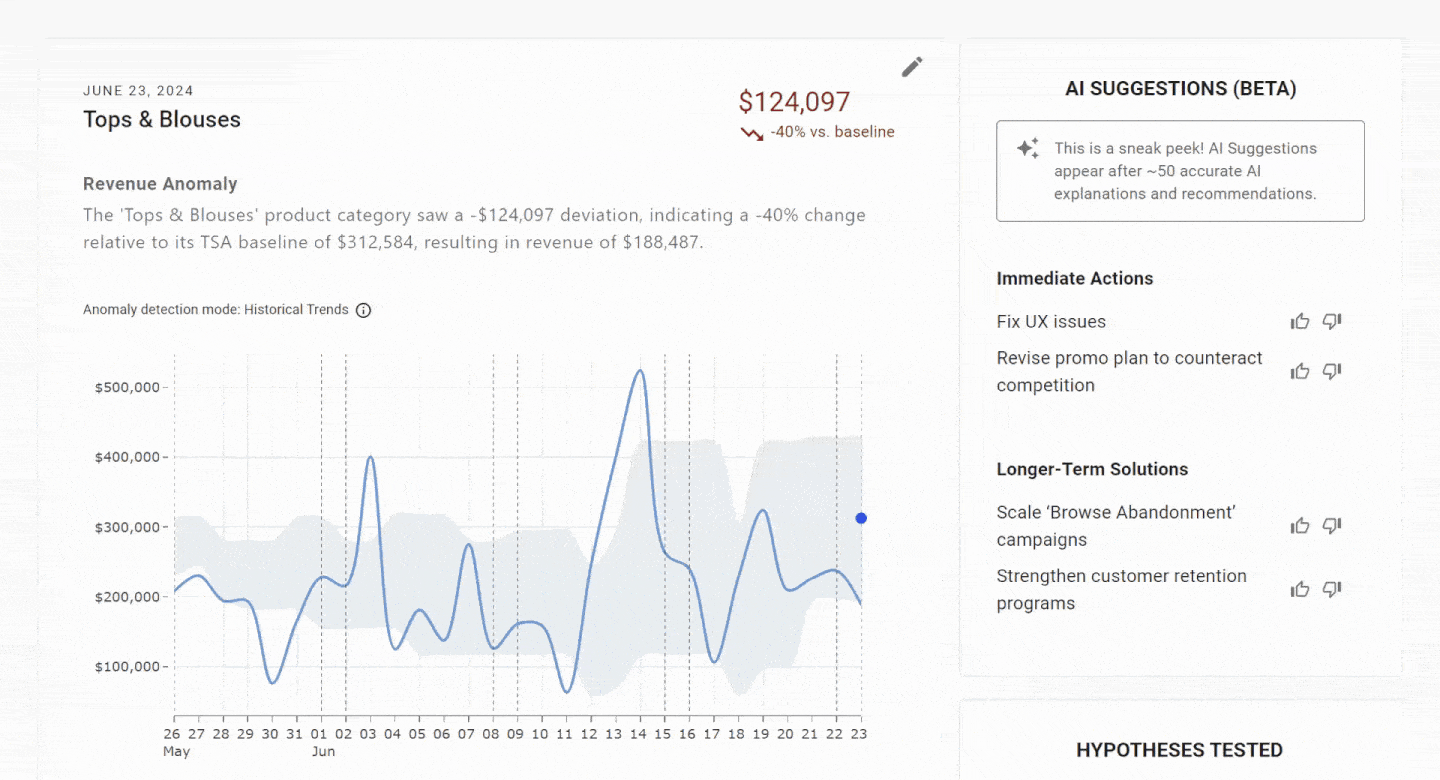 The platform learns through a process of AI-powered analysis, user feedback, and reinforcement learning. It starts by testing various hypotheses to explain anomalies and then learns from the results of these investigations. Users can provide feedback on the AI’s suggestions, which helps fine-tune the system. This iterative process enables the platform to continuously improve the accuracy and relevance of its analyses and recommendations.