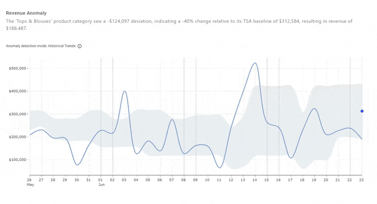 The Baresquare platform detects anomalies through a 24/7 anomaly detection algorithm, using two different modes: Revenue Plan (RP) where the expected values refer to business targets, and Time Series Analysis (TSA) which examines seasonality, trends, and patterns in historical data to set expected limits. The system flags significant deviations as anomalies with users being able to determine the sensitivity of the algorithms. If an anomaly is detected, the platform triggers root cause analysis and generates the explanations, plus recommended actions.