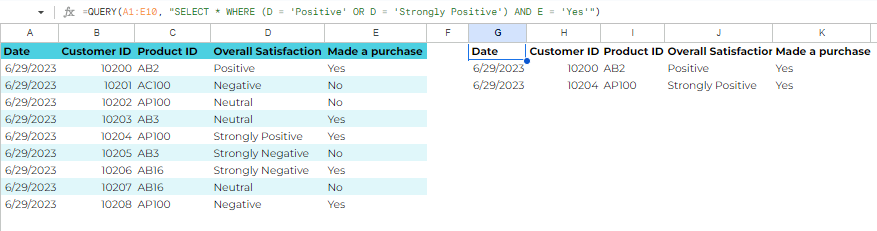 Imagine you have a dataset of customer feedback, and you want to filter the rows based on multiple conditions. Specifically, you want to display the feedback from customers who rated the product as either "Positive" or "Strongly Positive" and made a purchase. You can use the QUERY function with logical operators (OR and AND) to achieve this: