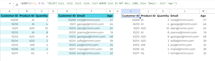 In this formula, {A:D; E:G} combines the two tables. The QUERY function then selects the desired columns (Customer ID, Product ID, Quantity, Email, and Age) and filters out the empty rows.