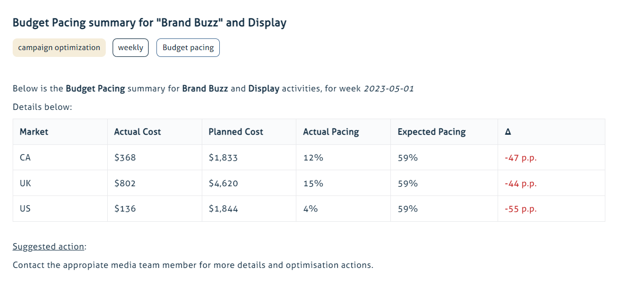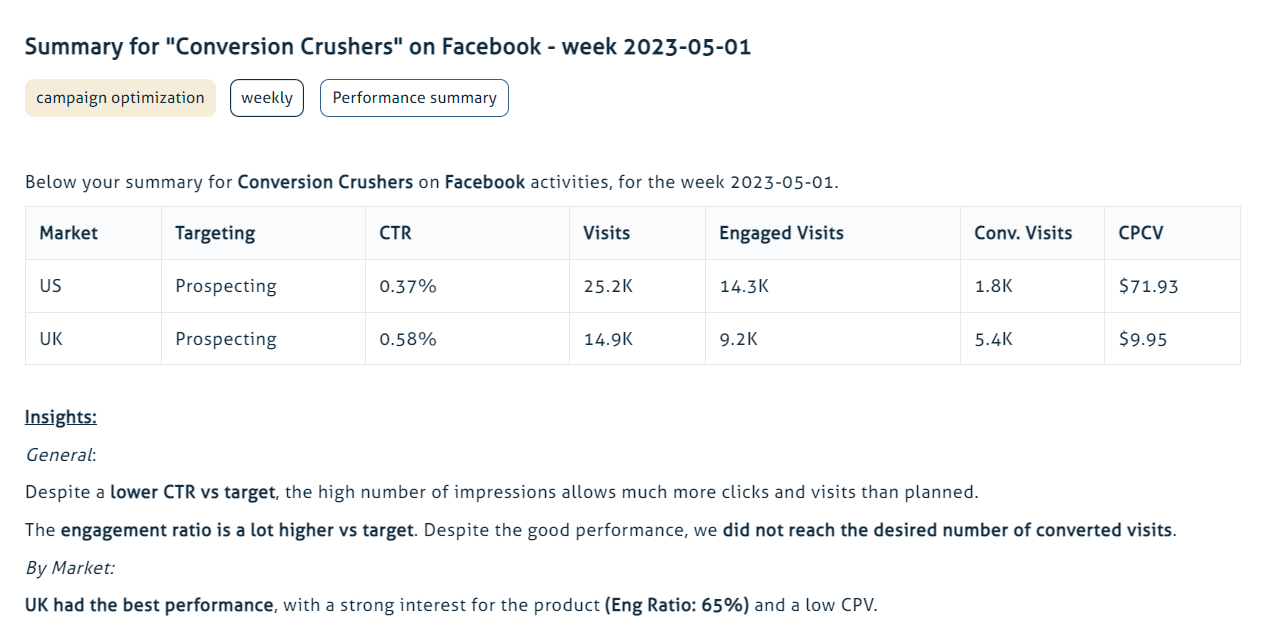 Campaign performance analysis can be a time-consuming endeavor, especially when dealing with large datasets. That's where automated insights come into play. With the help of advanced analytics tools and machine learning algorithms, marketers can leverage automation to rapidly analyze campaign data, detect patterns, and generate actionable insights. Having these insights automatically delivered every Monday, the analytics team gains the freedom to streamline their decision-making processes, identify trends, optimize campaigns in real time, and stay one step ahead of the competition.Embrace the efficiency of automated insights and unlock the true potential of your marketing strategies.